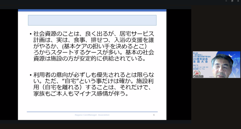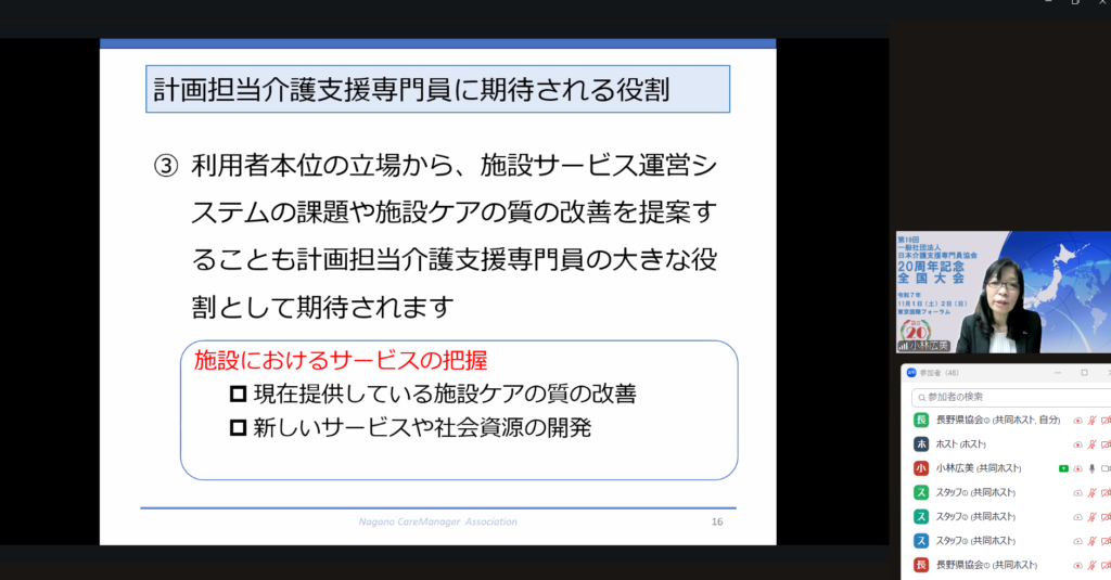 9月25日(木)、施設介護支援専門員向け研修会を長野県介護支援専門員協会生涯学習委員会の主催によりオンライン開催(Zoom使用)し、特別養護老人ホームや老健等に勤務する介護支援専門員42名が参加されました。