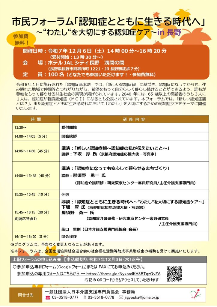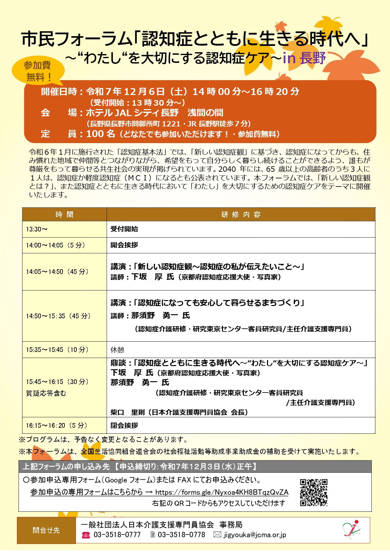 一般社団法人 日本介護支援専門員協会 » 【申込受付中・参加費無料!】市民フォーラム『「認知症とともに生きる時代へ」~“わたし“を大切にする認知症ケア~』(11/24福岡市・12/6長野市開催)