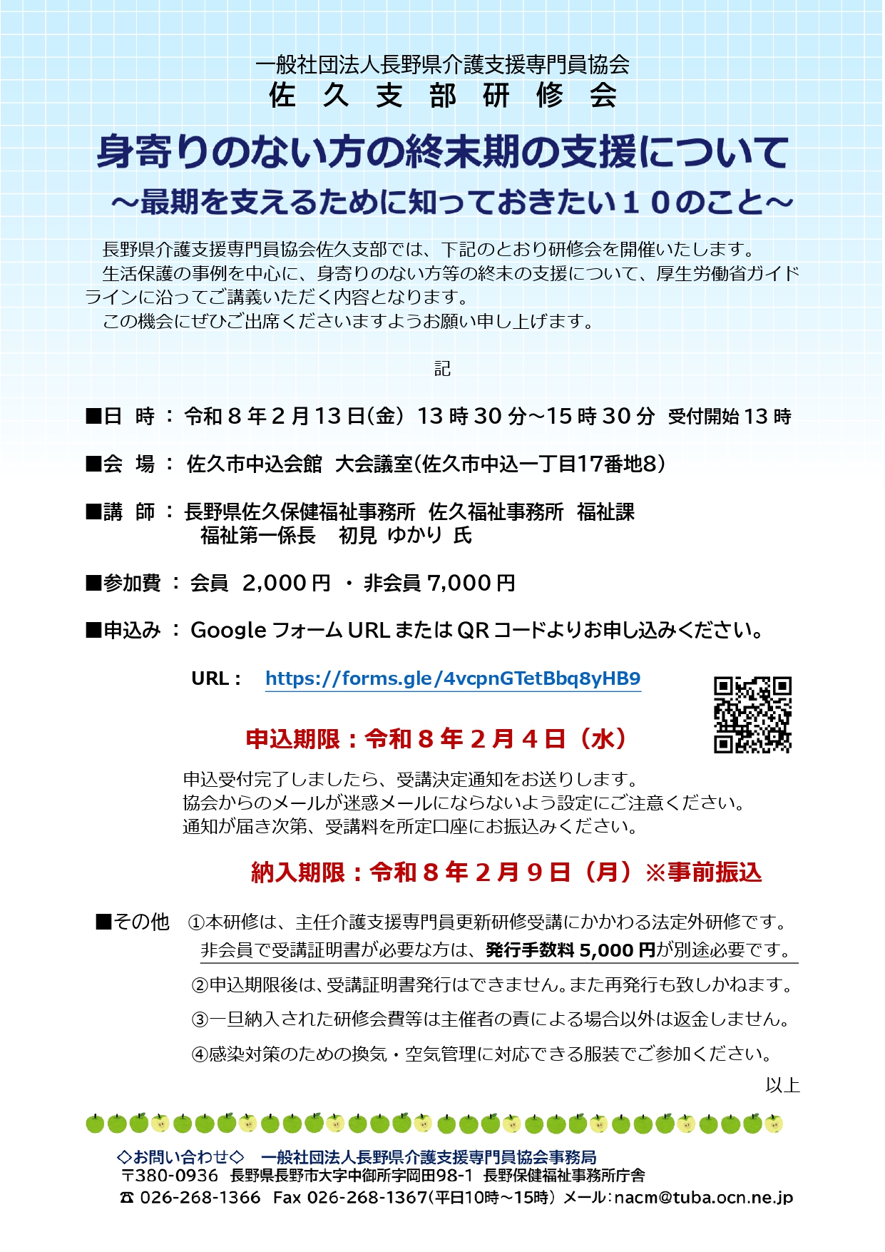 長野県介護支援専門員協会佐久支部では、下記のとおり研修会を開催いたします。